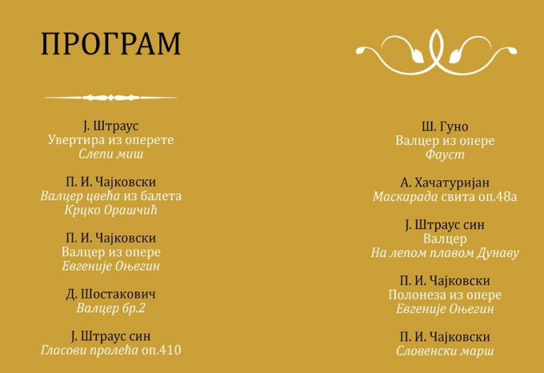 На репертоару ће се наћи најпознатији валцери из светске музичке баштине као што су: "Валцер цвећа" од Чајковског, Шостаковичев Валцер број 2, Гуноов Валцер из опере "Фауст" и многи други.