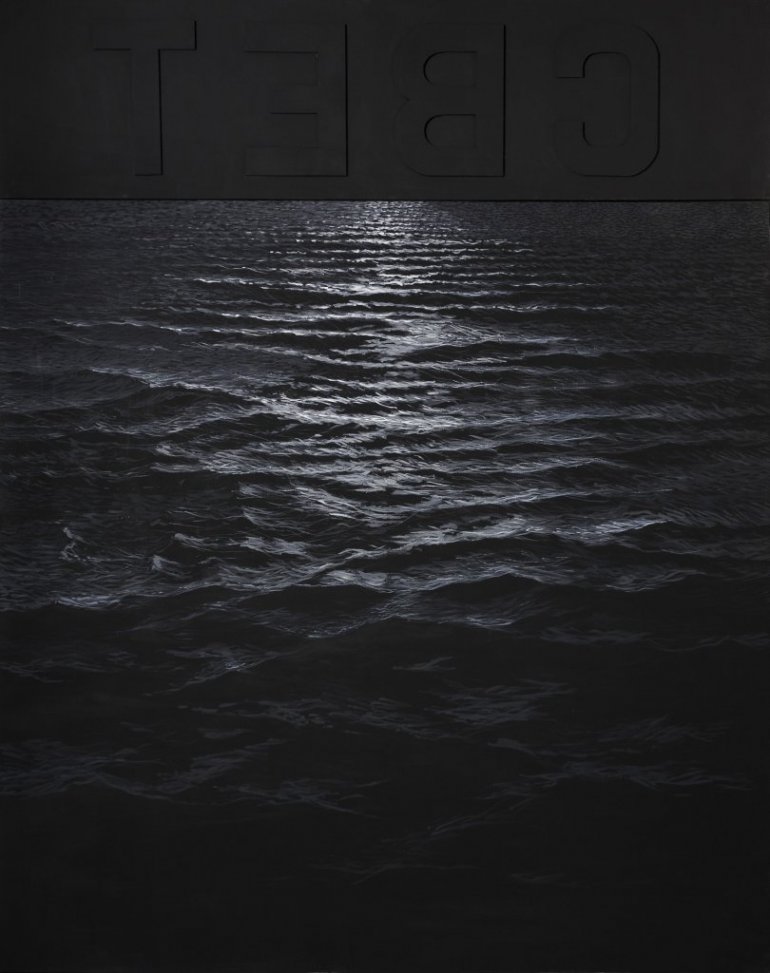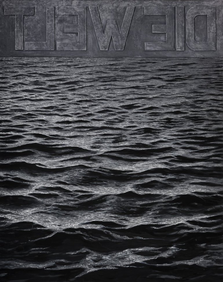 - Као и запитаност над тиме шта је заправо наш свет. Ову запитаност уметник обогаћује тиме што нас суочава са причом о културним кодовима који обликују нашу свест. Реч "свет" у изврнутом облику (као да је одражена у огледалу) на српском, енглеском, немачком и кинеском језику, служи као нека врста свода овим усталасаним површинама, и она асоцијације упућује у различитим правцима. Наш свет, традиција и култура, а реч је најјачи њихов симбол - и сами бивају извитоперени и померени.