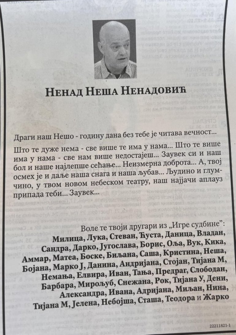 - Драги наш Нешо - годину дана без тебе је читава вечност... Што те дуже нема - све те више има у нама... Што те више има у нама - све нам више недостајеш... Заувек си и наш бол и наше најлепше сећање... Неизмерна доброта... А твој осмех је и даље наша снага и наша љубав... Људино и глумчино, у твом новом небеском театру, наш најјачи аплауз припада теби... Заувек... Воле те твоји другари из "Игре судбине" - пише у читуљи, а наведена су и имена глумаца који су дали читуљу.