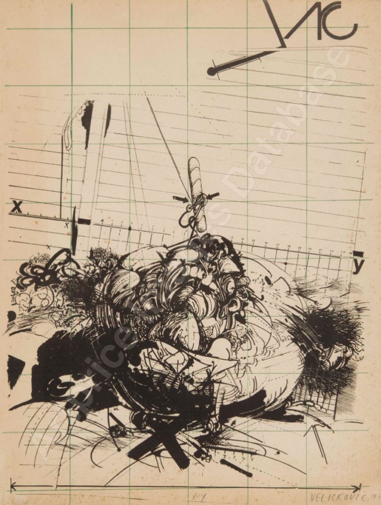Она указује на Величковићеве монументалне цртеже и графике (из 1966. и 1993), неколико сериграфија са колажом (1973) и литографије у боји (1967. и 1970), које показују квалитете, стваралачку проницљивост и истрајност овог архитекте и сликара.