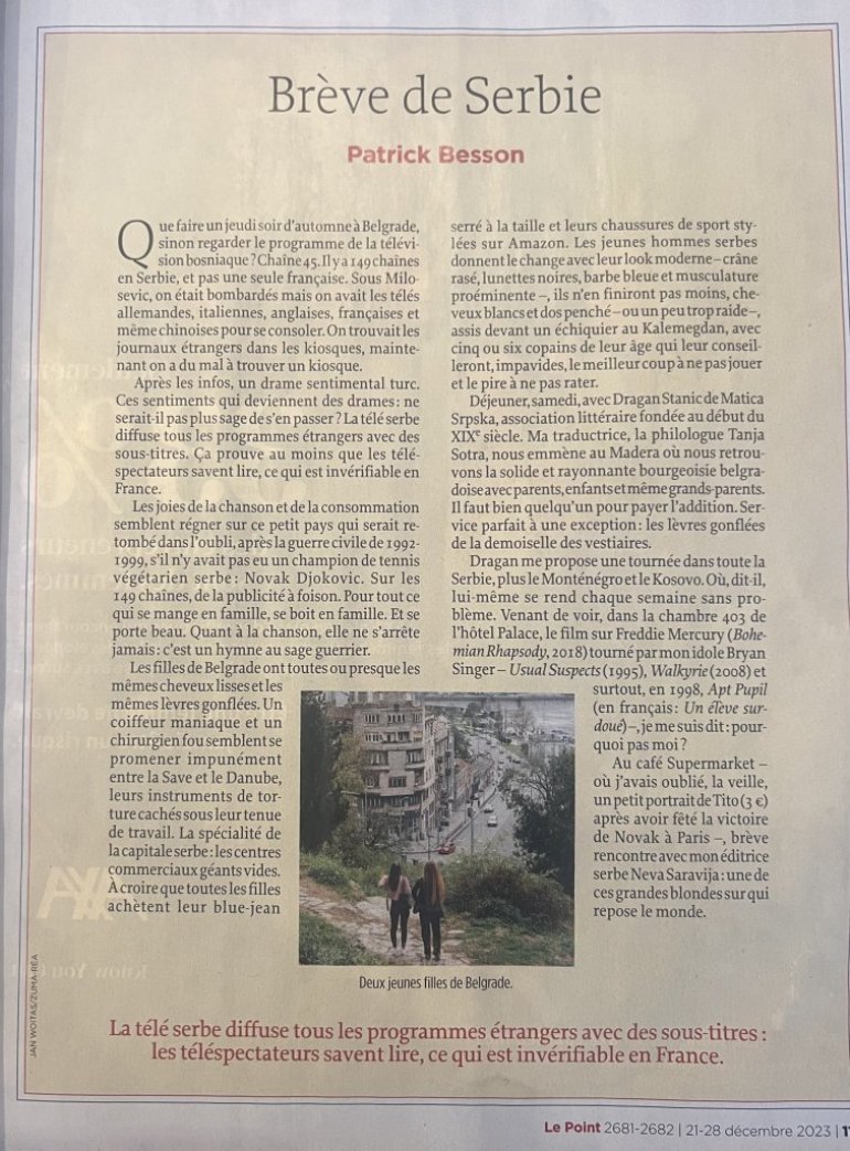Шармантан миг, пун свежег и двосмисленог хумора, дао је чувени француски писац Патрик Бесон Београду и Београђанкама, у својој редовној уводној колумни у француском недељнику "Поен".