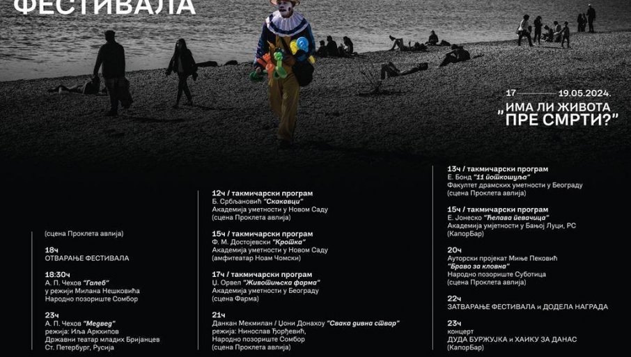 На сцени „Проклета авлија”, вечерас у 18 часова, на репертоару је представа „Галеб” Народног позоришта Сомбор, по мотивима новеле Антона Павловича Чехова, у режији Милана Нешковића. У 23 часа, по Чеховљевој причи „Медвед” биће изведена истоимена представа у режији Иље Аркхипова из Санкт Петербурга. Ову представу је припремио Државни театар младих „Бријанцев“.