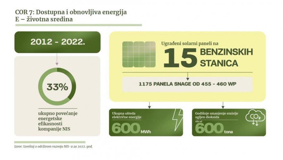 Спроводећи своју зелену агенду и следећи опредељење да повећа удео обновљивих извора енергије, НИС је почео уградњу соларних панела на бензинским станицама у нашој земљи. До сада је овај пројекат реализован на 15 станица за снабдевање горивом чиме се остварују позитивни пословни и еколошки ефекти. Наиме, употребом соларних панела укупна уштеда у набавци електричне енергије износиће око 600 MWh на годишњем нивоу, док се смањење емисије угљен-диоксида процењује на више од 600 тона годишње. НИС ће и у наредном периоду наставити са постављањем фотонапонских електрана на своју малопродајну мрежу и друге објекте.