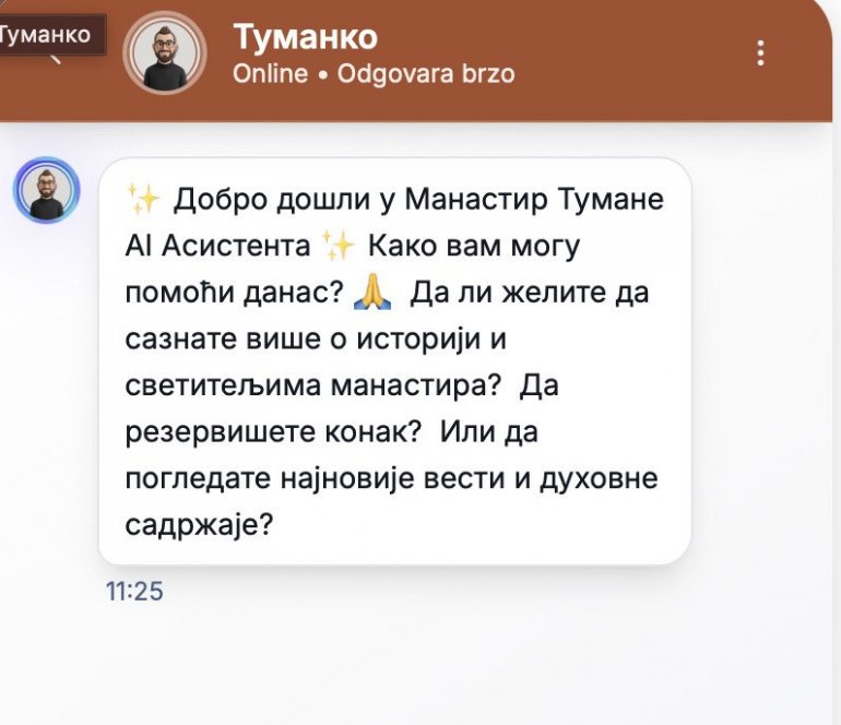 МАНАСТИР Тумане увео је на свом званичном сајту АИ четбота Туманка, а циљ је да се посетиоцима олакша приступ информацијама о манастиру.