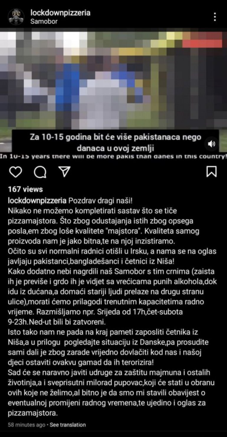 "НЕЋЕМО ЗАПОСЛИТИ ЧЕТНИКЕ ИЗ НИША, А НИ ОНЕ ЦРНЕ" Скандалозна шовинистичка и расистичка објава хрватске пицерије