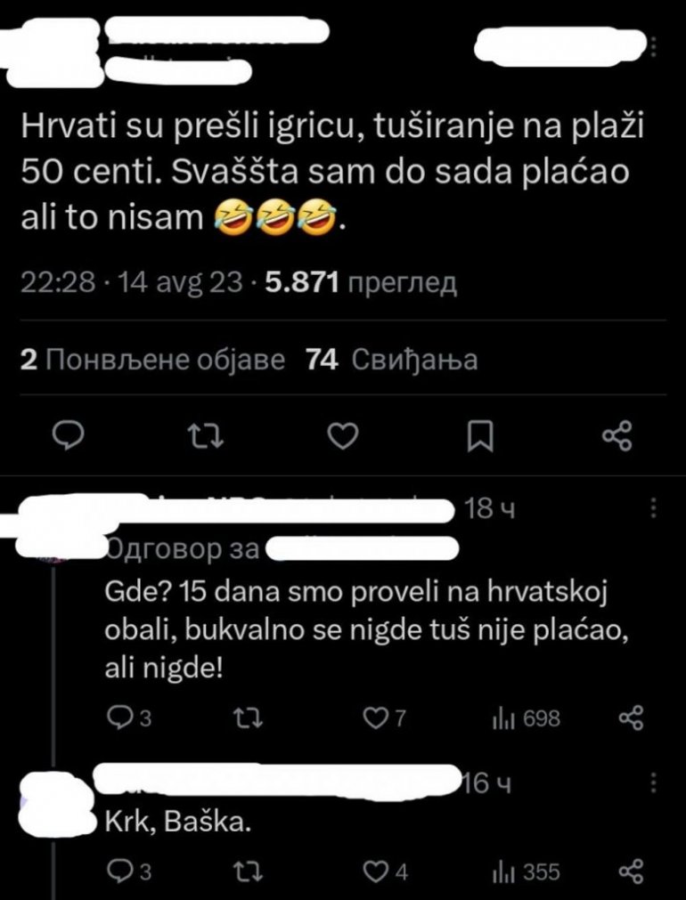 - Хрвати су прешли границу, туширање на плажи 50 центи. Свашта сам до сада прочитао, али то нисам - пише у једној објави на Твитеру која је покренула лавину коментара.