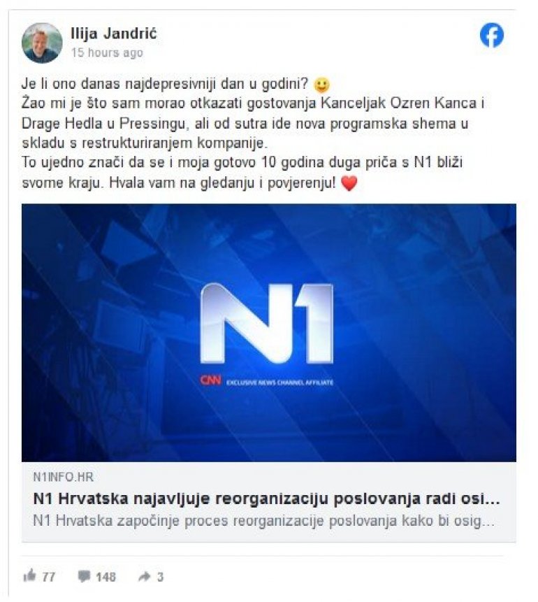- Реструктурирање, магична реч за отварање славине. Загорчати живот онима који производе најквалитетнији садржај док цео свет медија не постане једна бескрајна ливада сна и силицијума. Подршка свим колегама који су креирали и одржавали бренд Н1. Срећно, Илија, где год да кренеш! - написала је ТВ новинарка. Сандра Крижанец је на Фејсбуку написала: „За све који питају хвала и све је ок. Ускоро више..."
