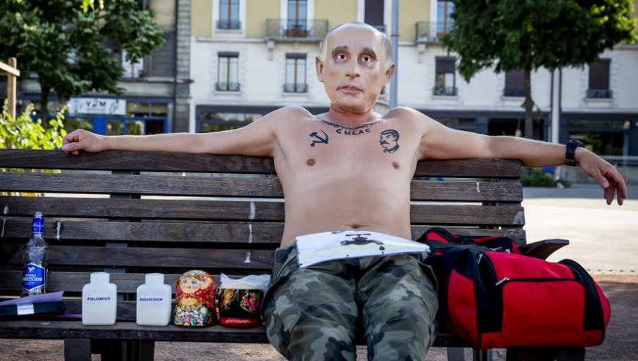 Голих прса, у војничким панталонама како би имитирао снимке са летњег одмора руског председника, демонстрант Александар Љубушин навукао је маску са Путиновим ликом и седео на клупи на сунчаном тргу у Женеви, претварајући се да држи вотку, пренео је Ројтерс.