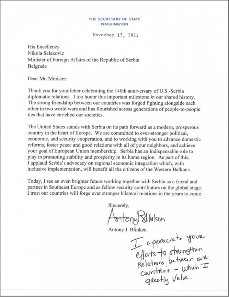 БЛИНКЕН УПУТИО ПИСМО СЕЛАКОВИЋУ: Незменљива је улога Србије за стабилност у региону (ФОТО)
