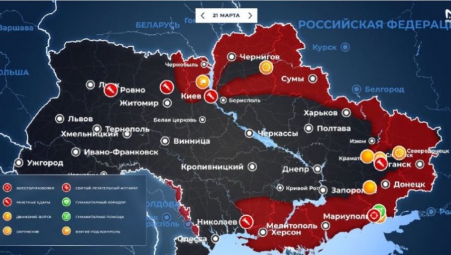 КИЈЕВ - На позадини борби западно и источно од Кијева, главна тема је био удар на тржни центар у северозападном делу Кијева. Повике о „нападу на мирни објекат” лако су прекинуте када се испоставило да је тржни центар коришћен као паркинг за МЛРС и самоходне топове, као и складиште муниције. Уз помоћ техничких извиђачких података прорачуната је позиција украјинске артиљерије и уништена је јувелирски прецизно. Након тога, у Украјини су почели да припремају закон који забрањује снимање положаја украјинске војне технике и људства под претњом затворске казне. Грађани који пријаве локацију и положаје украјинских снага мораће то да чине мало анонимније и опрезније. Близу Чернигова без промена.