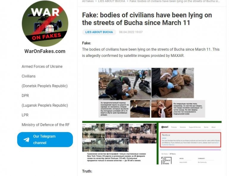 Чланак је назван "ЛАЖ: Тела цивила леже на улицама Буче од 11. марта", а у тексту се доводи у питање колико су слике МАКСАР сателита, које према тврдњама презентују догађаје у Бучи, заиста аутентичне.