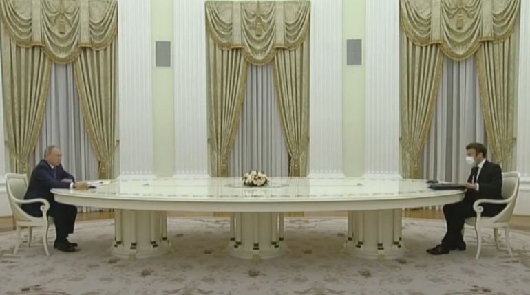 Успони и падови његовог првог мандата можда нису јасније илустровани него у контрасту чувене фотографије на којој слави победу Француске у финалу Светског првенства 4:2 над Хрватском у Москви и његовог повратка у руску престоницу четири године касније како би убедио председника Русије Владимира Путина да не покрене операцију у суседној Украјини, када су седели на крајевима веома дугачког стола, оцењује лист.