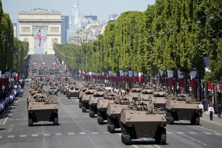 Претходно је на највећој западноевропској војној паради на Јелисејским пољима учествовало 6.300 војника, 64 авиона, 25 хеликоптера, 200 коњаника и 181 моторно возило. Као специјални гости позвани су учесници из девет земаља које су у највећем броју руски и украјински суседи - Естоније, Летоније, Литваније, Пољске, Чешке, Словачке, Мађарске, Румуније и Бугарске. Међу савременим оружјем, дефиловали су и топови "цезар" које Француска тренутно донира Украјини.