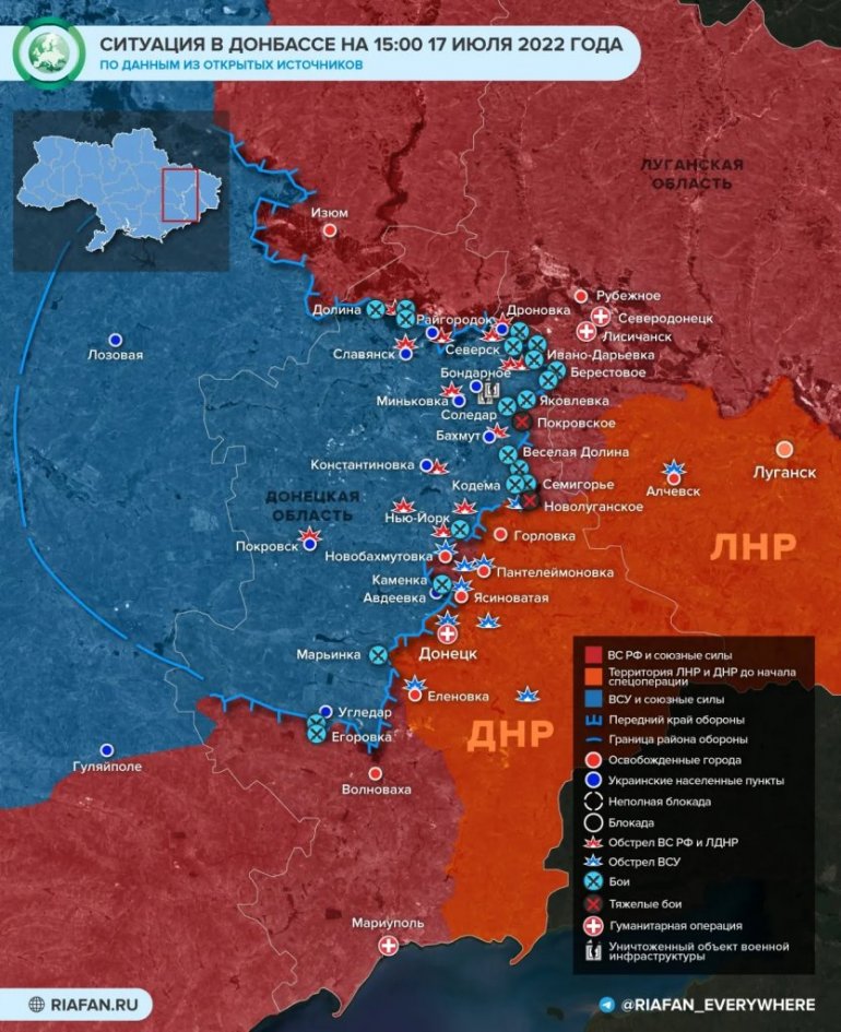 Линија фронта у Донбасу се удаљила од граница Луганске Народне Републике и сада се помера на Запад. Руске трупе су заједно са Народном милицијом појачале офанзиву на Северск, Соледар и Артемовск. Заузевши ову линију одбрамбених утврђења, наше трупе ће моћи да отворе пут за Краматорск и Славјанск.