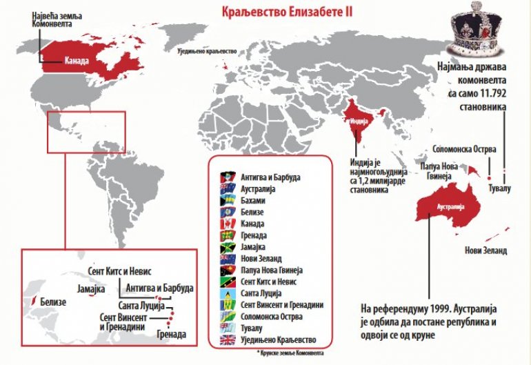 Од свих тих држава, 14 је и данас у најтешњој вези са британском круном, а међу њима су и "џиновске" државе - Аустралија и Канада.