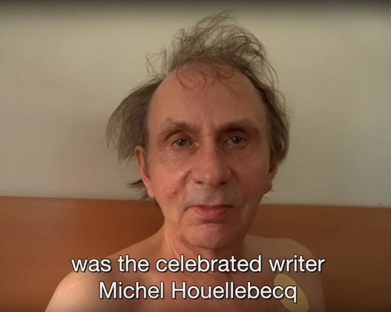 Холандска група аутора објавила је трејлер у коме се Мишел Уелбек (66) види голог попрсја како у једној хотелској соби страсно љуби младу девојку. Она је насмејана, он такође, и све говори да је у питању договорен однос. На крају овог кратког снимка, после загрљаја у кревету, Мишел Уелбек задовољно пали цигарету.