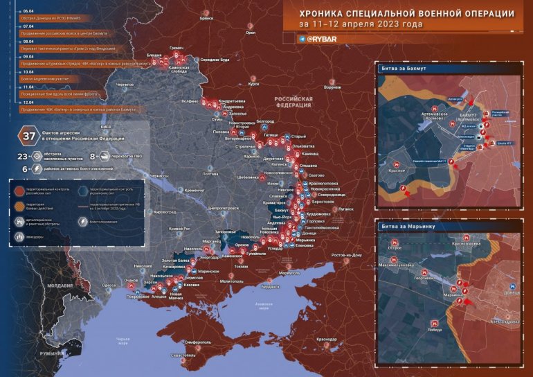 Оружане снаге РФ настављају да изводе операцију опкољавања ВСУске групације у Бахмуту. Вагнерове јуришне групе са бока подржавају јединице руских Ваздушно-десантних снага, наносећи ватрену штету украјинским формацијама.