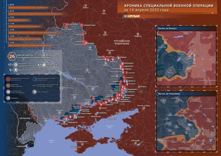 Од средине априла снаге украјинске војске су готово потпуно блокиране у западном делу Бахмута (Артјомовска). ПМЦ Вагнер је предао северни и јужни бок руским снагама (падобранцима) и фокусирао се на чишћење градских блокова, извештава "РТ интернешенел".