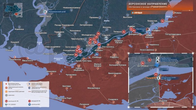 Такође, из Дњепропетровске области је по хитном поступку почело пребацивање јединица 93. Омбре Оружаних снага Украјине на Антоновски мост и хидроелектрану Каховскаја. 93. бригада се опорављала од борби у рејону Бахмута. У Антоновки су већ примећени понтонски прелази и инжињеријске групе Оружаних снага Украјине.