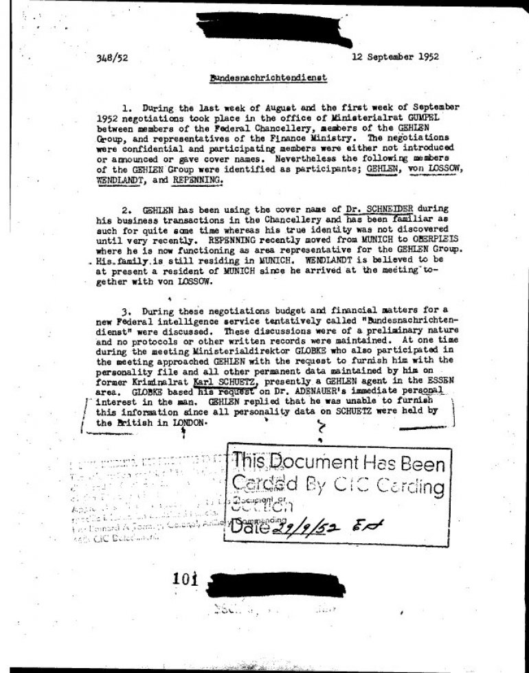 Американцима су били потребни везе и људи, а њих су имали функционери нацистичког система обавештајних служби. Уговор с новим послодавцима, Вилијемом Донованом, шефом ОСС, и Аленом Далсом, будућим директором ЦИА, направио је још 1945. нацистички генерал Рајнхард Гелен, командант обавештајног одељења генералштаба Вермахта - Сектор Исток. Он је реконструисао нацистичку агентуру која је до 1955. деловала под кодним именом ОГ (Организација Гелен), а када је те године Немачка приступила НАТО, она је озваничена као БНД - Савезна обавештајна служба Немачке.