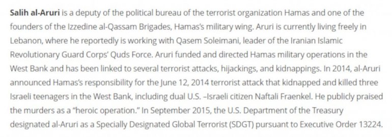 Стејт департмент је навео Ел Арурија као терористу и понудио награду од 5 милиона долара за информације о њему, наводи Асошиејтед прес.