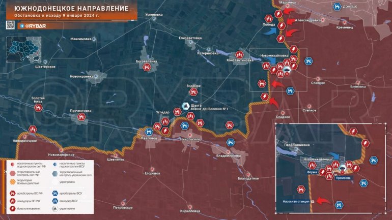 На правцу Угљедара се настављају тешке борбе за село Новомихајловку: заузето је упориште украјинских формација које су са југоисточне стране покривале улаз у ово насеље. Јужно од аутопута од Еленовке налази се њихова ватрена тачка, која спречава Оружане снаге Русије да уведу резерве. У рејону гробља, предузећа Синтезпродсервис и фабрике машина и трактора налазе се положаји ВСУ, а у центру села делује осматрачка опрема ВСУ. Било је извештаја о напредовању у шумском појасу јужно од Новомихајловке, међутим, ниједна страна нема поуздану контролу над тим. Неколико упоришта Оружаних снага Украјине заузето је у правцу Победе, међутим, генерално гледано, темпо напредовања Оружаних снага Русије у овој области је смањен након доласка ВСУ резерви. На линији борбеног додира јужно од Угљедара нема значајнијих промена.