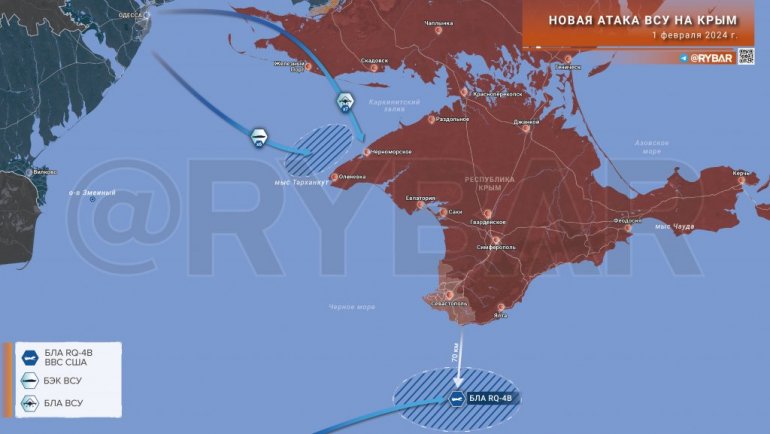 Истовремено, амерички дрон RQ-4B долетео је на обале Крима – стандардни гост под таквим околностима. Њен задатак се по правилу своди на проверу и процену рада 31. дивизије РВ и ПВО током планирања новог напада на Крим.
