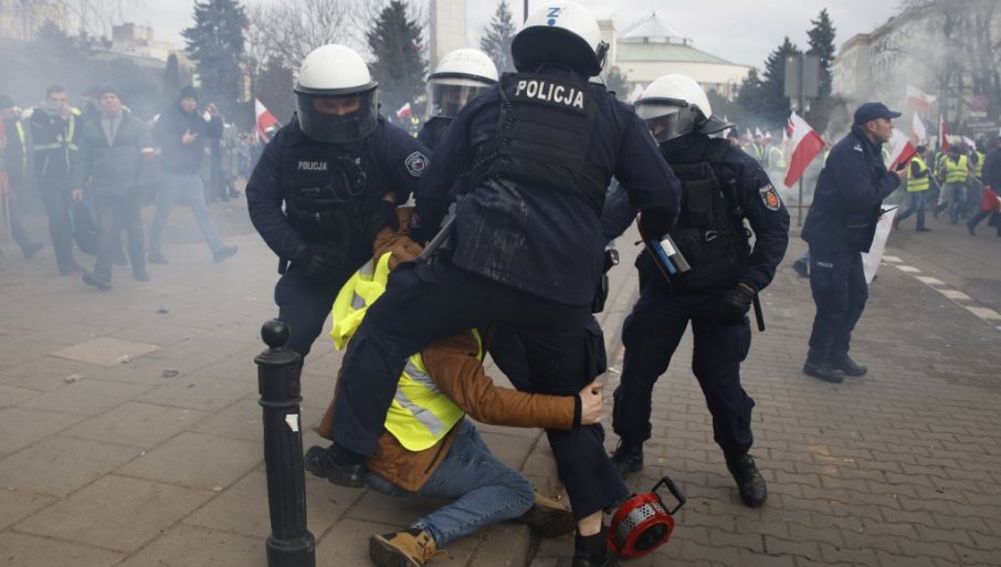ПОЉСКИ пољопривредници који су данас током протеста у Варшави подметнули низ пожара испред кабинета премијера Доналда Туска, сукобили су се са полицијом, а ухапшено је десетак особа.