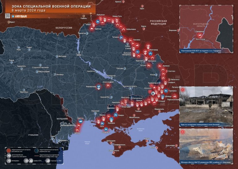 Као резултат ноћног рада Ваздушно-космичких снага Русије у Сумској, Харковској области и Константиновки, погођене су локације Оружаних снага Украјине. Илустрација telegram rybar
