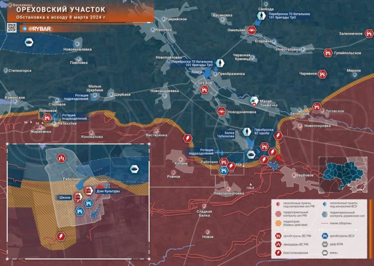 На правцу Запорожја руске јуришне групе, уз подршку оклопних возила, ушле су у блиску борбу са украјинским специјалцима. Према локалном мишљењу, Оружане снаге Русије имају иницијативу и надмоћ над снагама на сектору Работино-Вербовоје. Руски борбени рад је у великој мери компликован ФПВ дроновима Оружаних снага Украјине, проблем електронског ратовања остаје.