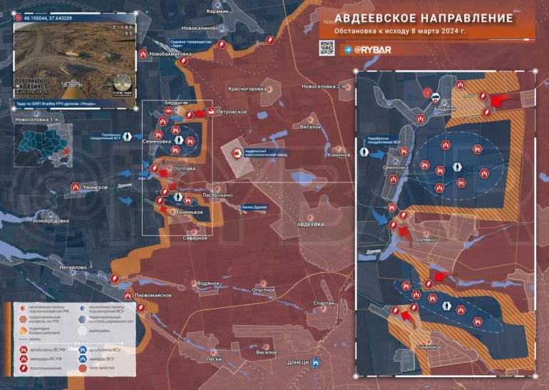 На Авдејевском фронту, руске оружане снаге су напредовале са североисточне стране Первомајског. На линији Бердичи-Орловка-Тоњењкоје, украјинске оружане снаге жестоко иду у контранапад. Руски положаји се држе. Истина, украјински ресурси најављују пребацивање још 5-7 бригада у ову област.