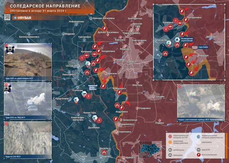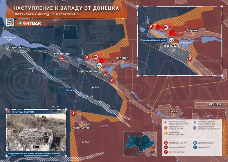 У сектору Авдејевке настављају се упорне борбе на јужној периферији Семјоновке, као и у Бердичију. Западно од Тоњењкојеа руска војска напада на Јаснобродовку. Код села Соловјево, још један Абрамс је погођен Ланцетом, а руски авиони и дронови нападају другу линију одбране ВСУ: Зарја – Новобахмутовка – Соловјево – Новопокровское – Новоселовка.