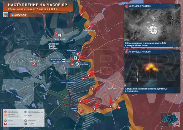 ВСУ довлачи резерве и иде у контранапад. На страни Оружаних снага Украјине активно се користе беспилотне летелице и касетна муниција, на руској страни авијација помаже са ФАБ-овима, а ради и артиљерија. Према једној верзији, главнокомандујући Оружаних снага Украјине Сирски ће послати јуришну бригаду забрањеног Азова у Часов Јар. Она која је помогла Оружаним снагама Украјине да дуже држе Артјомовск, али у Авдејевки то није утицало ни на шта. Сада је нови задатак главнокомандујућег да задржи Часов Јар.