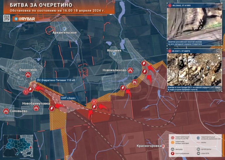 Тренутно, руске снаге контролишу источни део Новокалинова и ушле су у јужни део Керамика. Истовремено, Новокалиново се покрива са три стране одједном, укључујући и страну баштованског партнерства Зарја (Очеретинска дача) које је раније стављена под контролу.