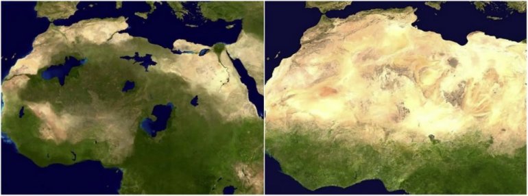 Испод је слика која упоређује како је изгледала северна Африка пре неколико хиљада година, како верују научници. Била је то зелена површина испуњена животом, али су је временске промене претвориле у суво, вруће подручје које познајемо данас.