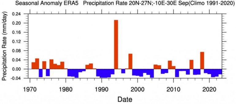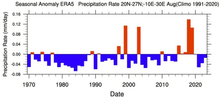 Одлучили смо да направимо графикон за падавине изнад Сахаре, који покрива месец август. Видите аномалије падавина за сваки август у последње 53 године, са само 4 године које показују јаку аномалију и више падавина. Са четири догађаја у протеклих пет деценија, то даје мање од једног таквог догађаја по деценији.