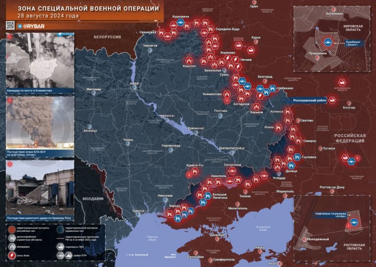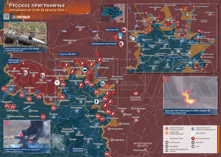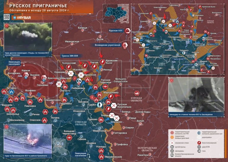 Фронт је код Курска непромењен у стратешком смислу. Међутим, Оружане снаге Украјине, иако трпе приметне губитке у људству и опреми, имају локалне успехе. Руска армија покушава да обузда непријатеља, наставља да идентификује маневарске групе непријатеља у шумским плантажама и локално врши контранапад. Наша авијација много ради.