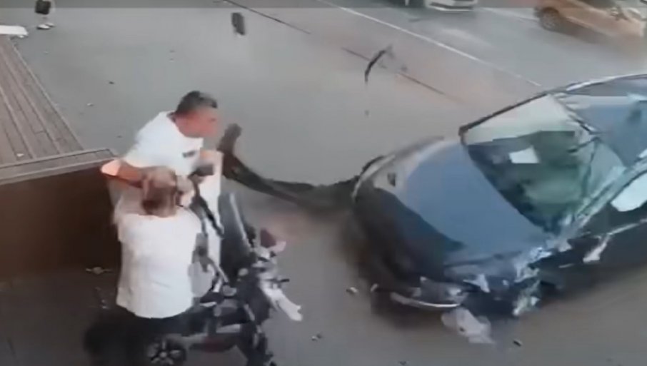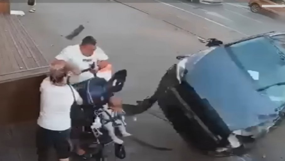 Мушкарац је шетао дете у колицима по тротоару, када се аутомобил, који је тренутак пре тога учествовао у саобраћајној несрећи, преврнуо и полетео ка њима. Невероватним рефлексом, отац-херој је у последњем тренутку успео да склони дете са путање аутомобила, пише Антена Обсерватор.