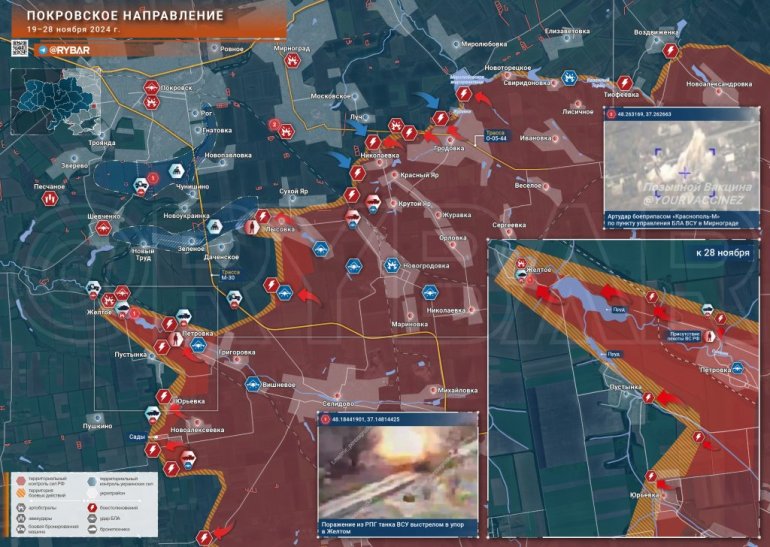 На Покровском фронту постоје локални успеси. Над Берестким је подигнута руска застава, али тамо још трају акције чишћења. У Сонцовки нема промена, воде се борбе. Западно од Селидова, руске оружане снаге су напредовале путем Селидово-Покровск ка Даченском. Борбе се воде на јужној периферији Лисовке – њено ослобођење ће довести руску армију у позадину Даченског гарнизона, а прве куће Покровска удаљене су мање од 4 км одавде.