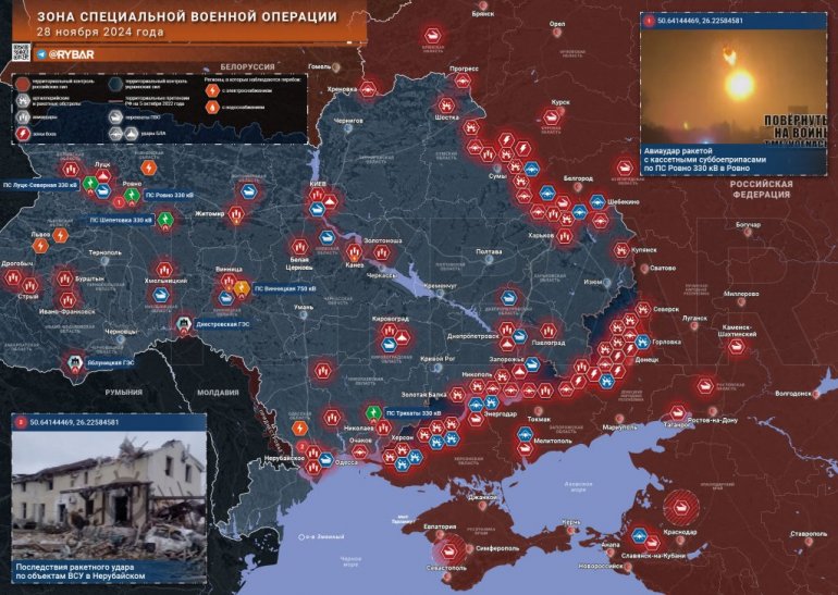Ваздушно-космичке снаге Русије извеле су данас један од најмасовнијих удара на енергетски сектор Украјине. Укупно је током ноћи лансирано 90 пројектила и око 100 дронова. Више од 10 трафостаница и производних објеката је озбиљно оштећено. У регионима западне Украјине без струје је остало око милион људи, најраспрострањенији порази су у Лавовској и Ровенској области. У Сумској области су успели да униште 3 лансера ХИМАРС.