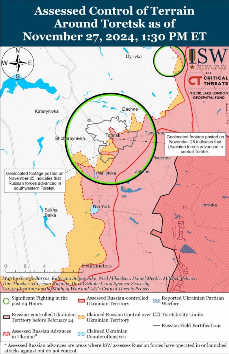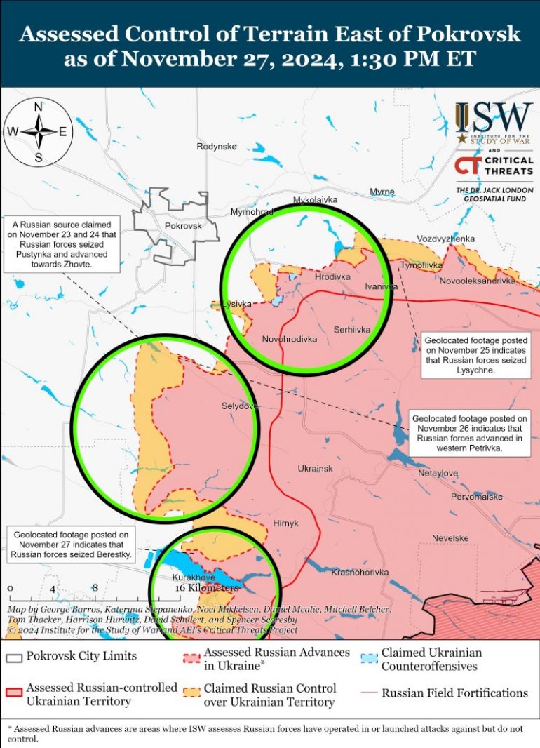 Најновија мапа ISW-а приказује руско заузимање Берецког у среду, Розодолног јужно одатле у уторак и Лишичног у понедељак. Пријављени су и руски напреци северно од Курахова.