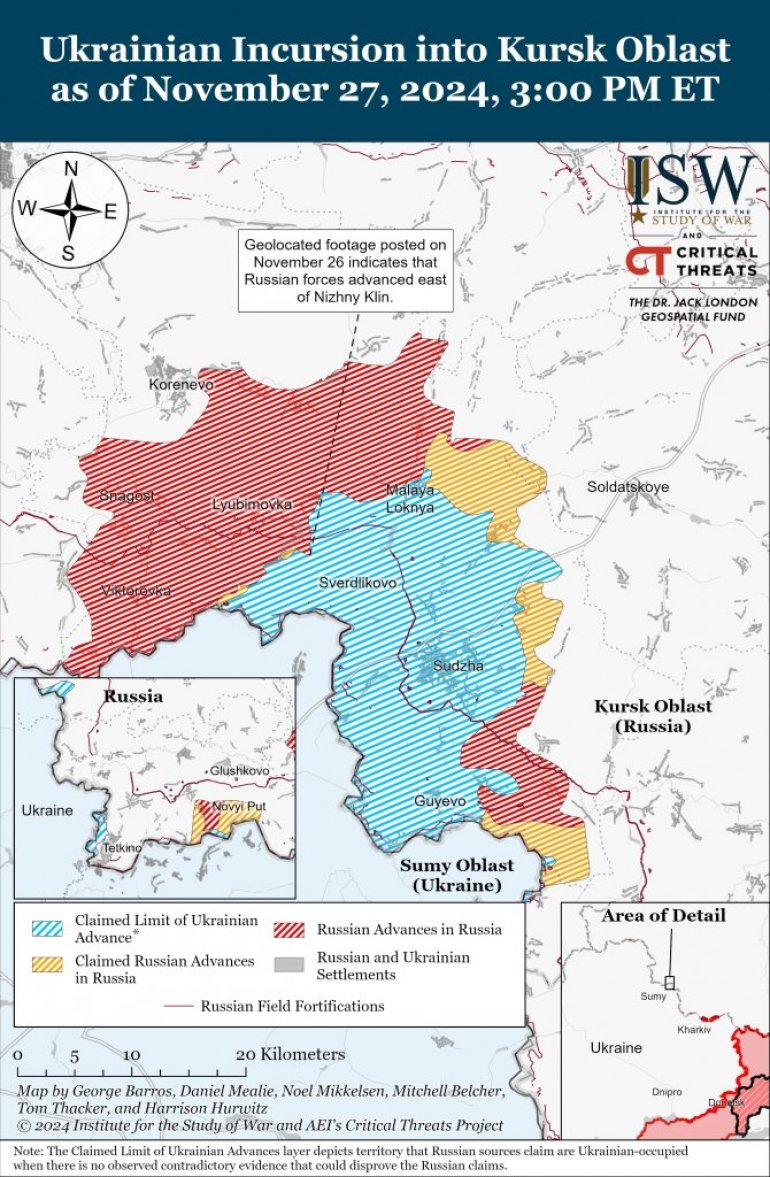 Мапа Института за проучавање рата (ISW) приказује неке од ових развоја, укључујући тврдњу руског Министарства одбране да је Москва у уторак заузела село Копанке. Снаге Кремља напредовале су југоисточно и јужно од Покровска, логистичког чворишта чије заузимање би значајно помогло Русији у циљу освајања остатка Доњецке области.