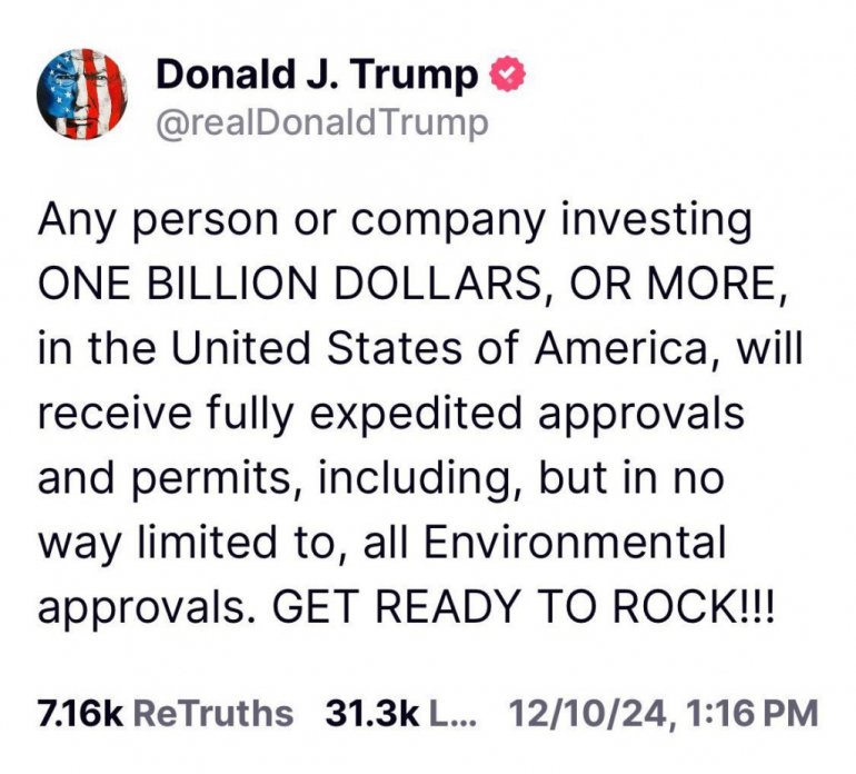Трамп је, наиме, саопштио најважнију вест: свака компанија или појединац који уложе милијарду долара у Америку, добијају све еколошке дозволе одмах, без изузетка и ограничења!