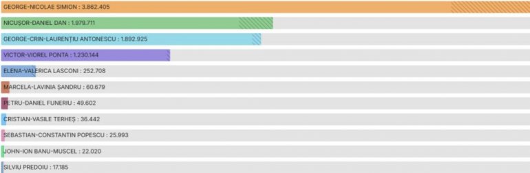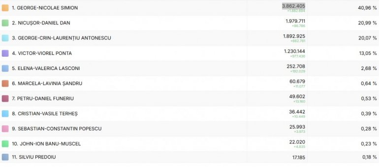 Први резултати у недељу после 22 сата су избацили Симиона на прво место, а следио га је Крин Антонеску, Виктор Понта, Никушор Дан и Елена Ласкони. Након пребројавања гласова, преносе румунски медији, са 34 одсто пребројаних изборних јединица, градоначелник Букурешта се попео на треће место. Следећа промена у рангирању догодила се после поноћи када је Дан прешао на друго место, претекавши Антонескуа.