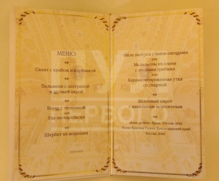 На менију су били медаљони од јелена, кнедле са кавијаром од јесетре и штуке, карамелизована патка, сорбе од малине...