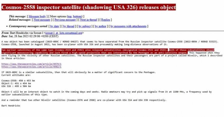 ПРЕМА тврдњама америчких војних извора, руски сателит-инспектор “Космос 2558” је у јуну ове године избацио додатни објекат на орбиту, који је класификован као “Објекат Ц” (Object C).