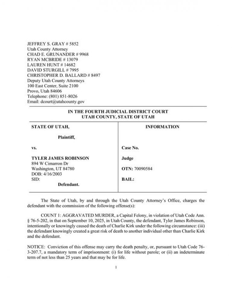 Робинсон би могао да се суочи са смртном казном уколико буде осуђен за убиство Чарлија Кирка, које се догодило прошле недеље на Универзитету Јута Вели.