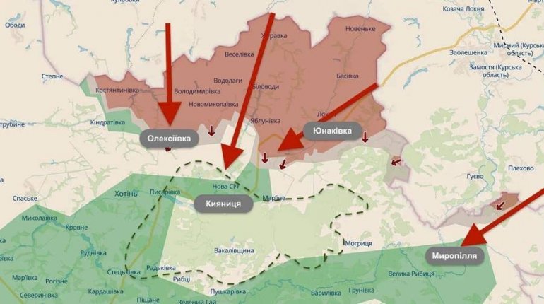 Главна линија напада остаје подручје које су Руси заузели између села Олексијевка, Јаблоњивка и Јунаковка. Са ове стране, Руси имају три „крака“, дуж којих се протежу према селима Хотин, Писаревка и Новаја Сич.