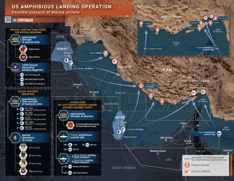 Повремено се покреће питање копнене операције САД и Израела против Техерана. Али Сједињене Државе практично немају значајне копнене снаге у региону (што је кључна разлика у односу на 1991. и 2003. годину). Чак је и флота повучена на већу удаљеност од обале како би се смањили губици.