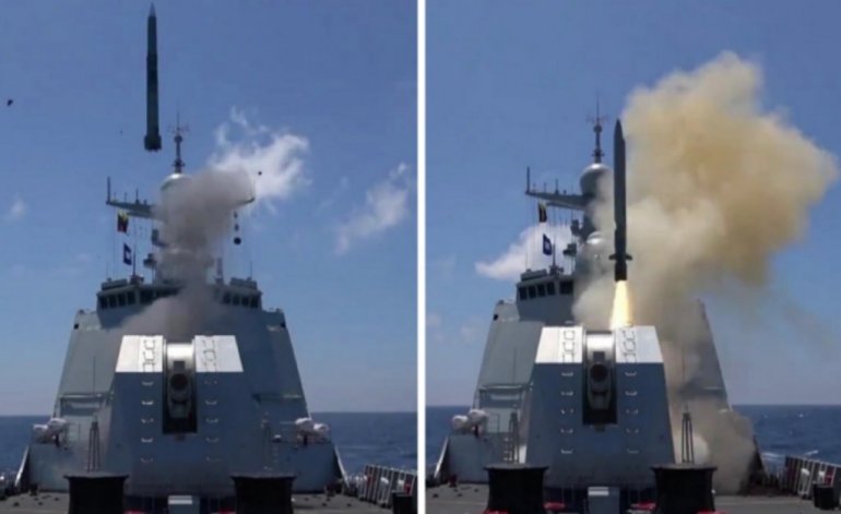 СНИМЦИ које су објавили кинески државни медији приказују новонаручени разарач класе типа 055, Анћинг, који гађа мете током вежбовне обуке више бродова у сложеним електронским условима.